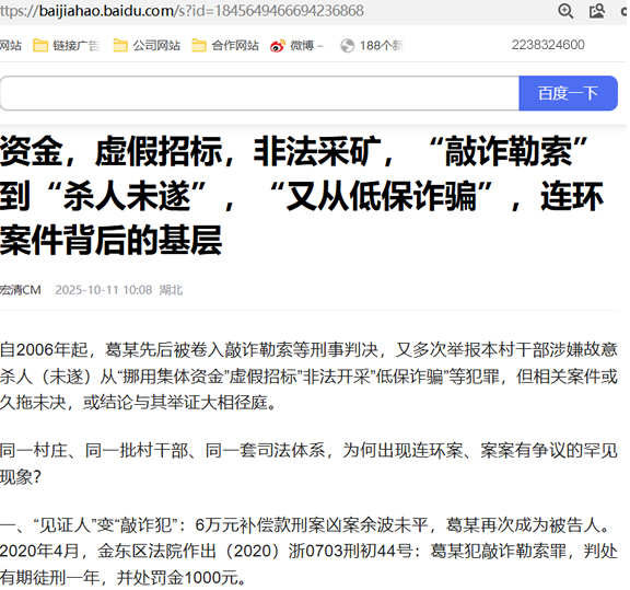 自2006年起,葛某先后被卷入敲诈勒索等刑事判决,又多次举报本村干部涉嫌故意杀人(未遂)从“挪用集体资金”虚假招标”非法开采”低保诈骗”等犯罪,但相关案件或久拖未决,或结论与其举证大相径庭。